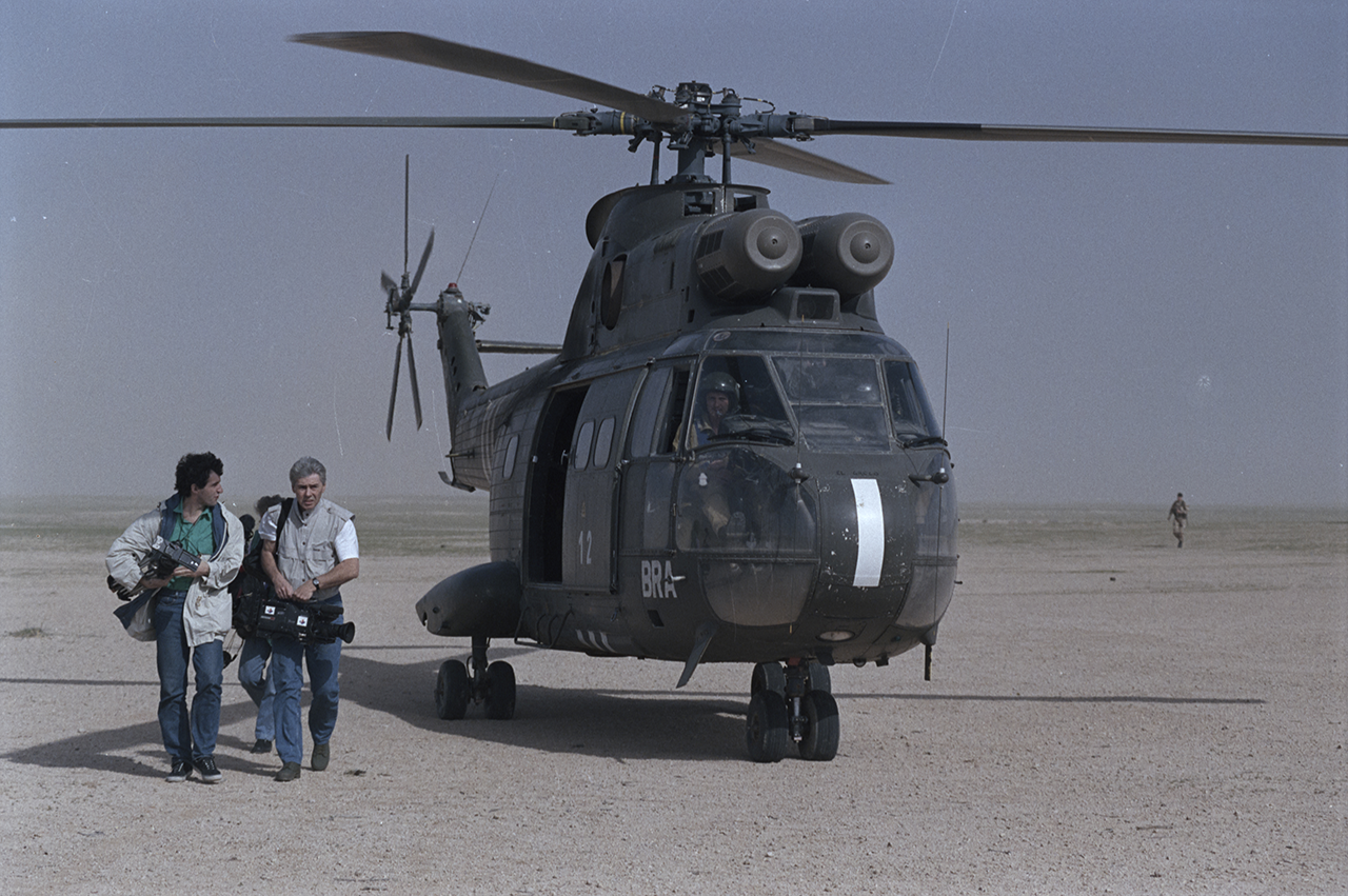 Une équipe de journalistes débarque d'un hélicoptère de transport Puma SA-330 pour assister à la cérémonie militaire de départ du camp.