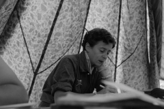À Muong Khoua, sous une tente en parachute, la journaliste Brigitte Friang rédige son article.