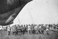 La manoeuvre d'un ballon d'observation de type Caquot est effectuée devant un groupe de correspondants de guerre français.