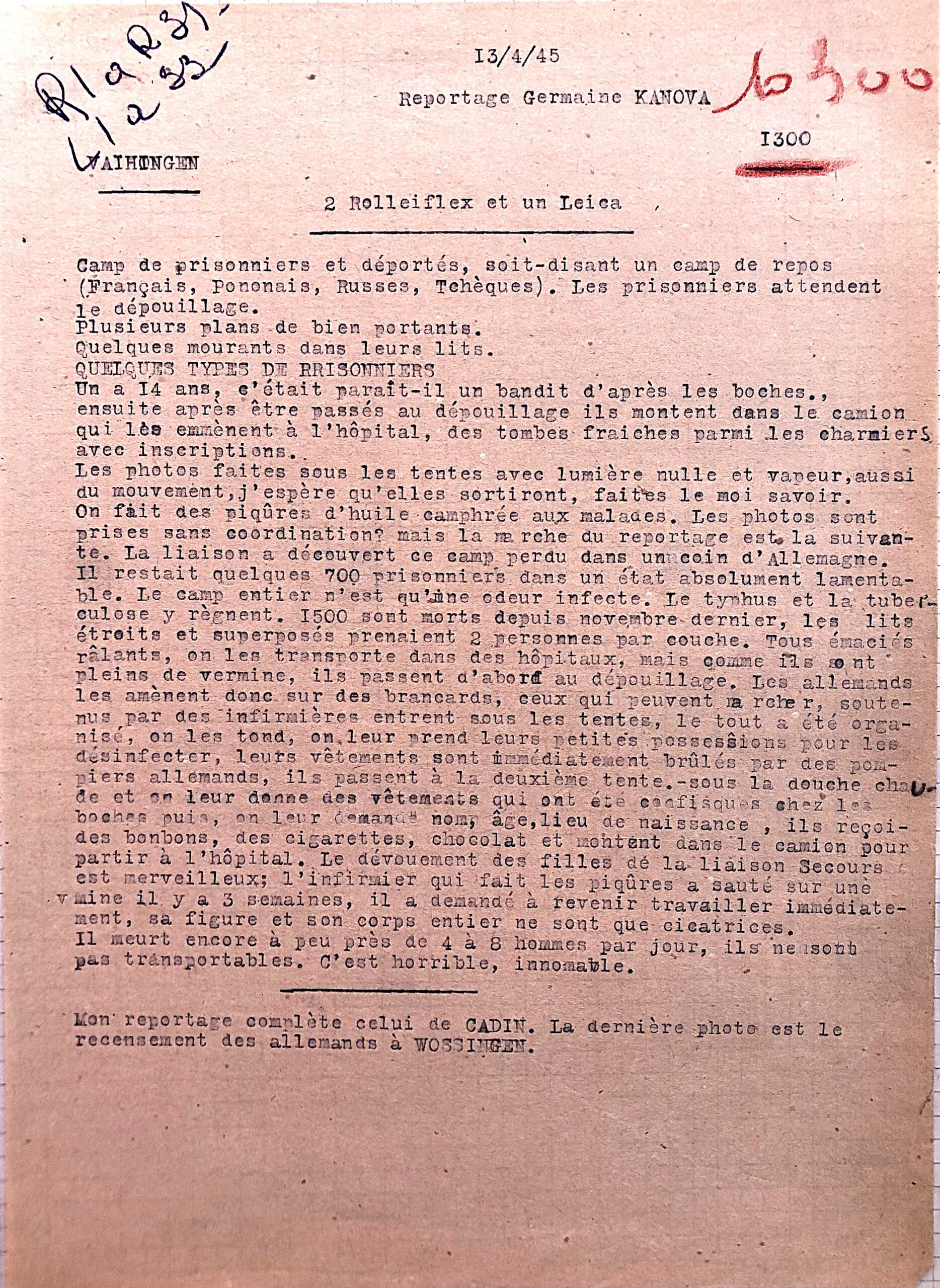 - circonstances et date de de la découverte du camp (on peut relever que le camp a été découvert le 7 avril et que Germaine Kanova a effectué son reportage le 13 avril, soit 6 jours plus tard) ;